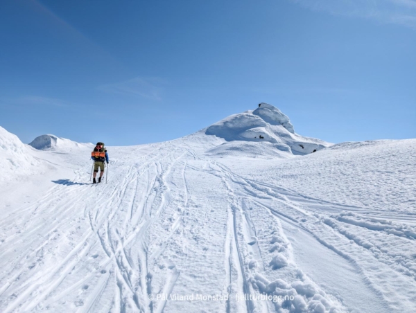 Etter frokost og hyttevask tok det ikke lange tiden før turfølget kunne legge i vei i retning Snønuten. Vi fant snøen kort oppe i lia, på andre siden av brua. Samme rutestart som sommerruta inn Kyrkjesteinsdalen. Det vanligste rutevalget til Snønuten med ski under beina er inn starten på Kyrkjesteinsdalen og deretter bratt opp Nedre Reindalen. Vi tok derimot en noe mer utradisjonell vei opp ei bratt fonn vest for topp 1131. Vi gikk videre sørover og passerte vest for topp 1242, før vi i sørvestlig retning kom til toppen av Nedre Reindalen. Herfra fulgte vi ryggen mellom de to vannene, oppover mot toppen, omtrent der som sommerruta går.