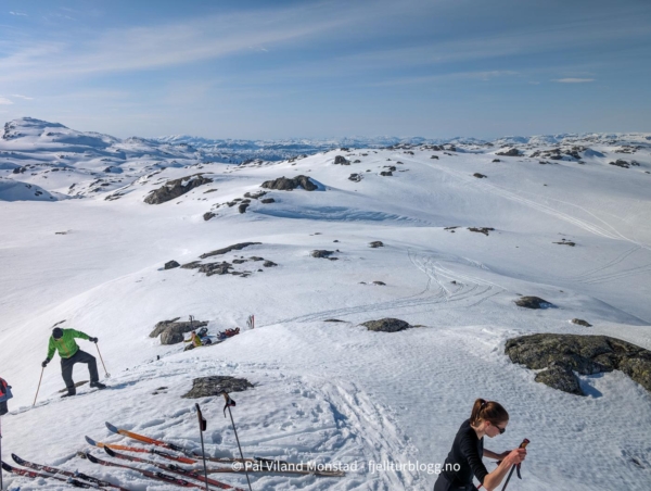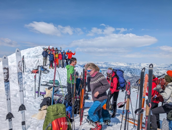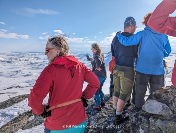 Et stykke før toppen tok vi igjen et annet turfølge som var på dagstur. Oppe ved varden på 1604 moh var det rene skjære køen for å komme opp på varden, som for det meste var dekket av snø. Jeg tipper vi var rundt 30 personer på Snønuten samtidig!