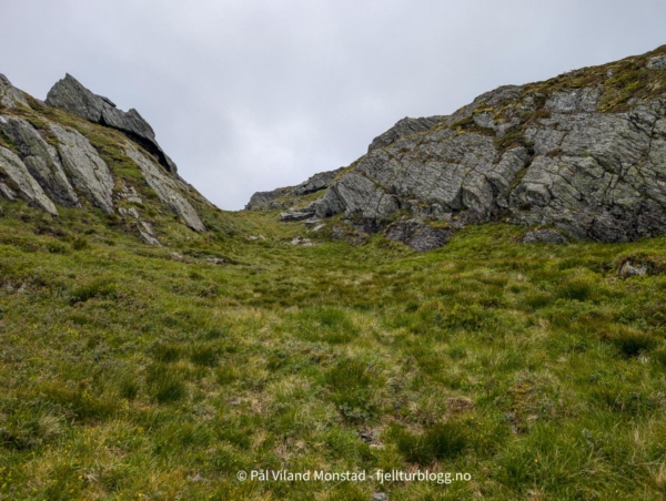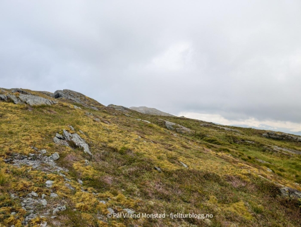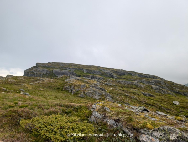 Det var bratt stigning i retning skaret, men flatet etter hvert ut. Øverst i skaret dreide jeg nordøstlig, og toppen kom til syne. Ingen varde, bare et tidligere trigonometrisk punkt.