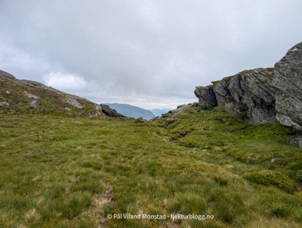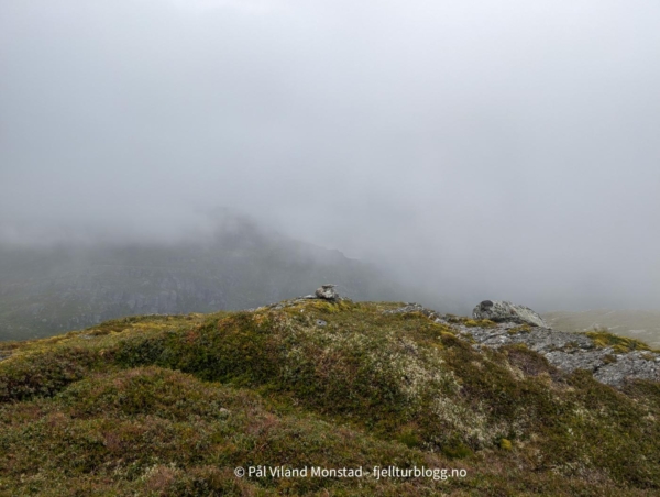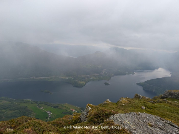 Fra toppen, som ligger helt på kanten over Stordalen, var det storslagen utsikt. Det tok dessverre ikke mange minuttene før utsikten forsvant i skyene som kom drivene inn, fulle av nedbør. Oppholdet ble derfor kortvarig, og jeg fulgte ikke planen om å gå til toppene videre østover. I stedet ble det samme rute tilbake til bilen, i ganske så våt yr.