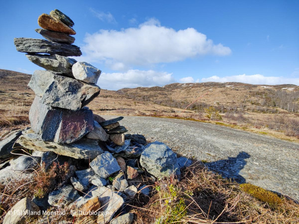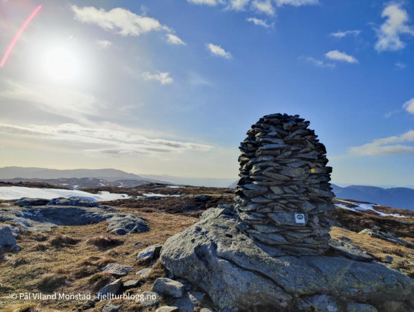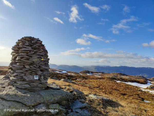 Turen gikk til Steinfjellet ved Olalia. Toppen ligger i Etne kommune, men turen startet fra Oppheim i Ølen. Jeg fulgte grusveien innover til nordenden av Ongelsvatnet. Her fant jeg stien som er inntegnet på kartet. Den var merket med gulmalte pinner og steiner, og ellers ganske tydelig i terrenget. Noe myr, men ganske lettgått. Ett bratt parti, før det igjen flatet ut mot toppen. På toppen var det en stor, flott varde. Steinfjellet ligger inne som “telltur”, så det var bare å sjekke inn via Norgeskart Friluftsliv.