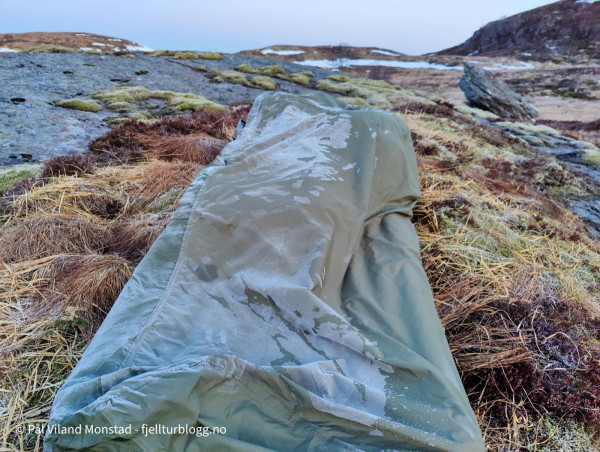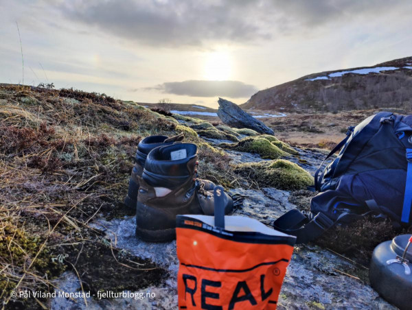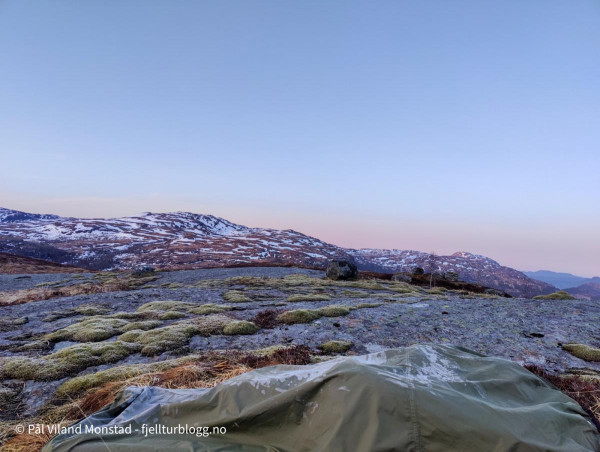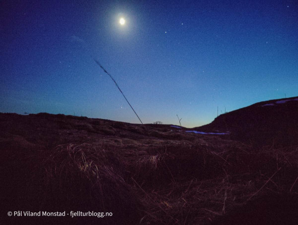 Etter middag var det i grunnen bare å pakke seg ned i posen. Lunt og fint, men absolutt temperatur og vind som tilsa både bøff og lue. Jeg våkna litt over midnatt. Da hadde vinden løyet, og skyene forsvunnet. Flott å ligge å se opp på stjernehimmelen. Jeg skal ikke påberope meg verdens beste søvn, og jeg våkna flere ganger i løpet av natta. Rikelig anledning til å kikke på stjernehimmelen! I tretida starta orrfuglene leiken sin. Jeg kunne høre den spesielle lyden til orrhanene, og de var sikkert ikke langt unna. Jeg kikka ut, men det var ganske vanskelig å bestemme hvor de holdt til. I alle fall ikke helt i nærheten, og det frista lite å stå opp for å finne de.
