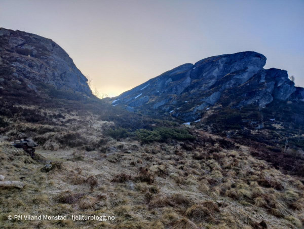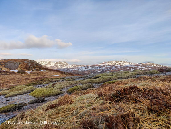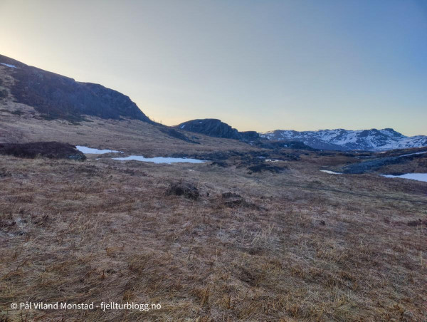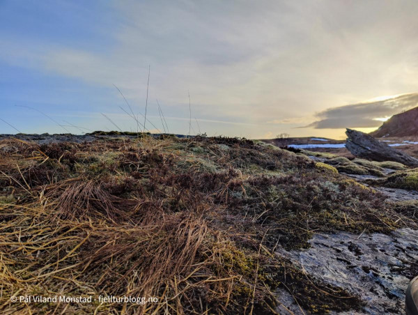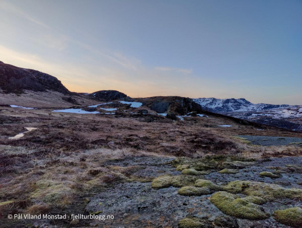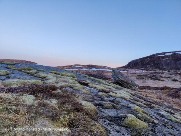 Det var en sur og kald vind i høyden, og det fristet lite å ligge oppe ved varden. Jeg tok derfor ned lia sør for toppen. Ganske bratt, men likevel ikke noen utfordringer nedover. Jeg endte opp nede på myra sør for Staurskorsnibbene. Her fant jeg noen fine berg, som alltid er greit å ligge inntil når man ligger i grevling (eller telt for den del). Det var også mindre vind, selv om det var ganske kaldt her og.