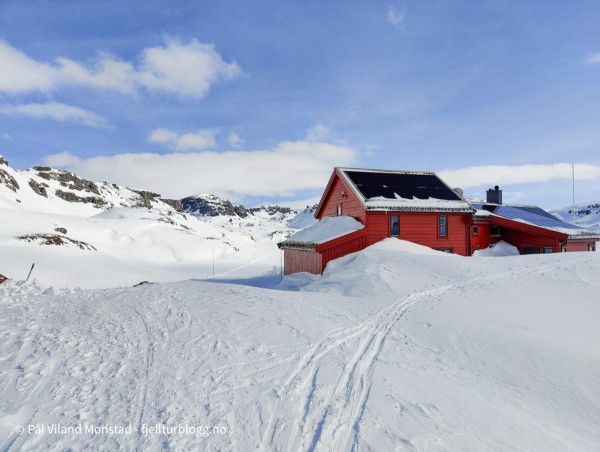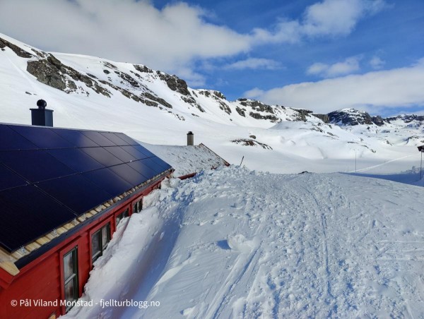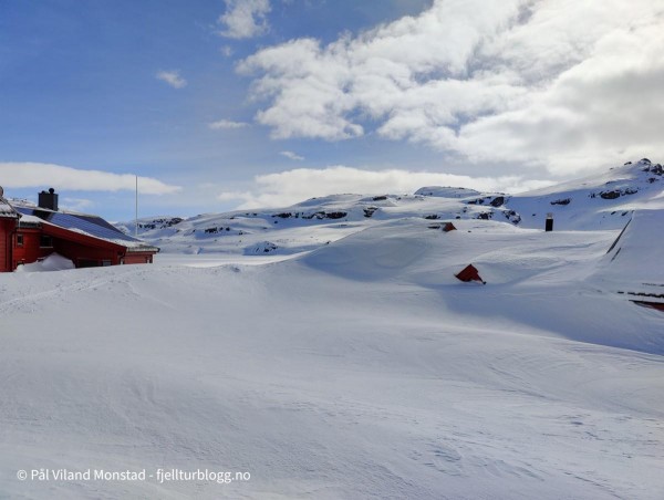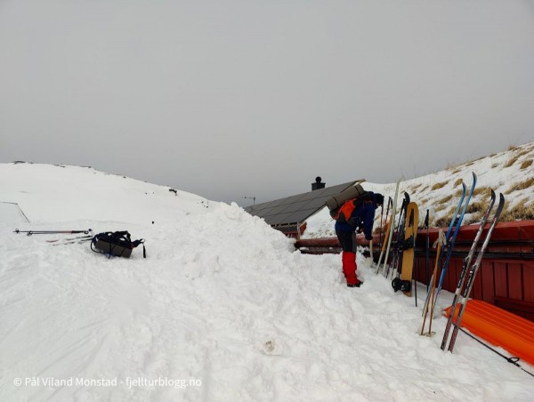 Vel framme var det bare på konstantere at dette er ei skikkelig snøhåle. Flere av byggene var helt eller delvis gjemt under snøen. Hovedhytta som brukes om sommeren er stengt nå på vinteren, men både toaletthytte og helårshytte er åpen. Helårshytta var devis begravd i snøen, og vi måtte ned for å komme inn døra. Bare øverste del av døra var måka fri, så det var godt det sto en stol på innsiden for å gjøre entreen litt lettere for halvgamle folk (meg, ikke resten av turfølget).