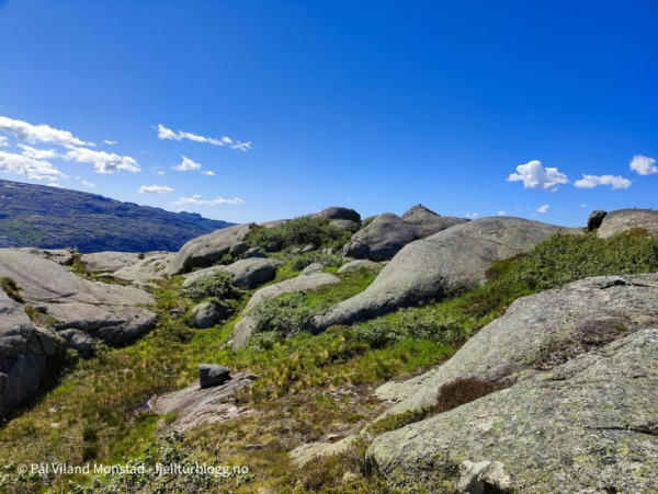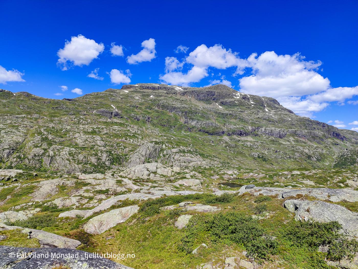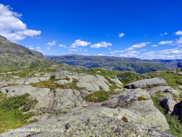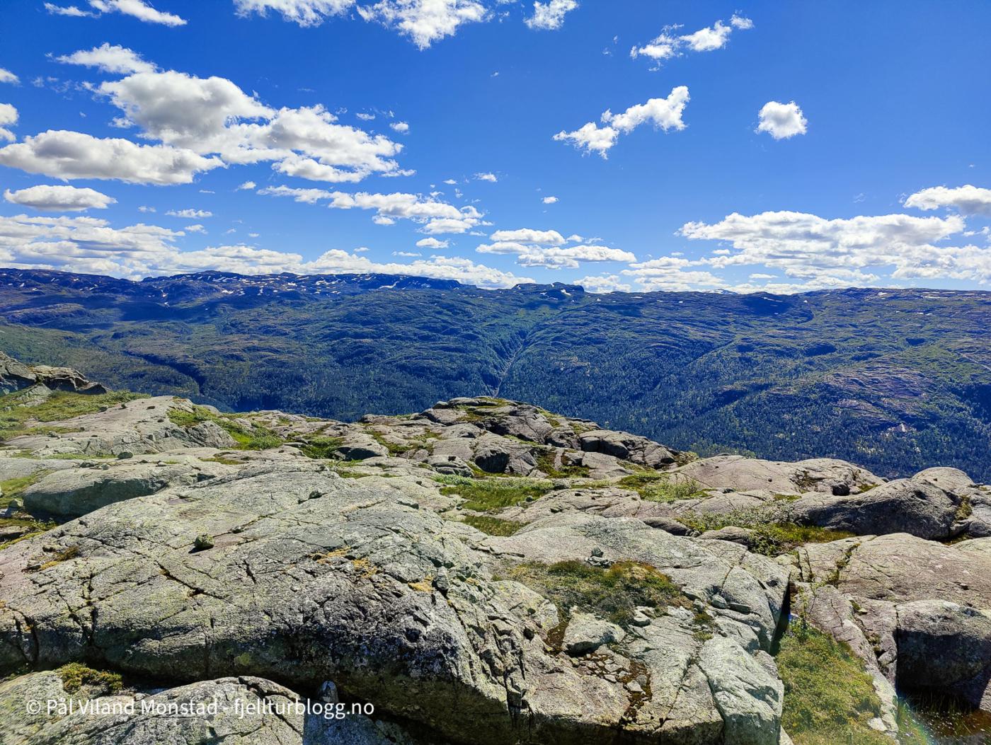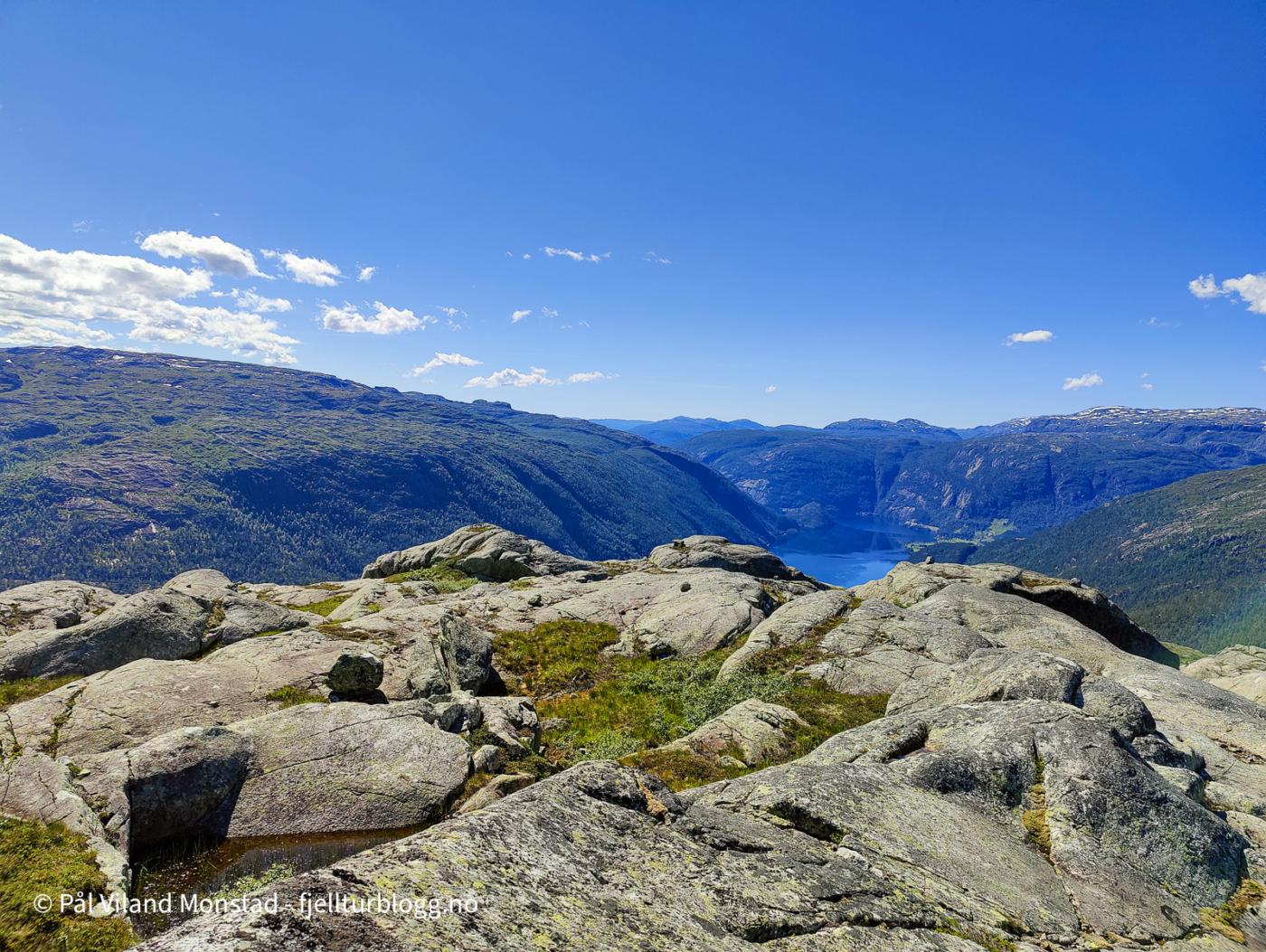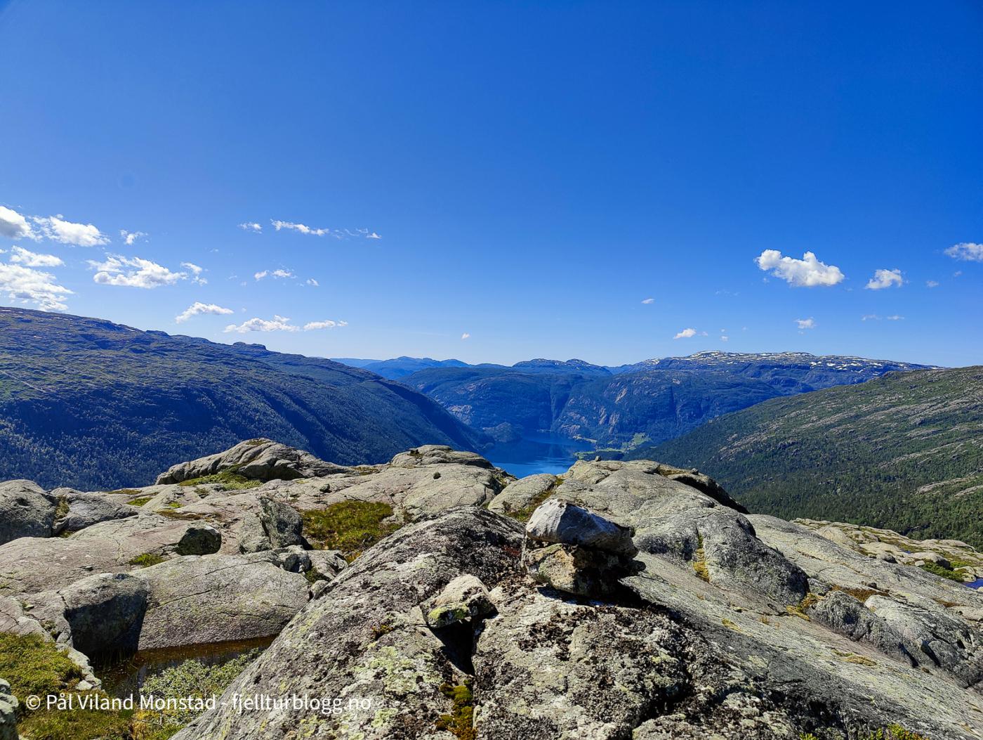 På toppen var det ingen varde, bare en stein. Antakelig ikke en veldig mye besøkt topp. I nord tronet den langt mer besøkte og majestetiske Mælen. Utsikt mot Suldalsvatnet og topper rundt. Jeg tok samme vei tilbake.