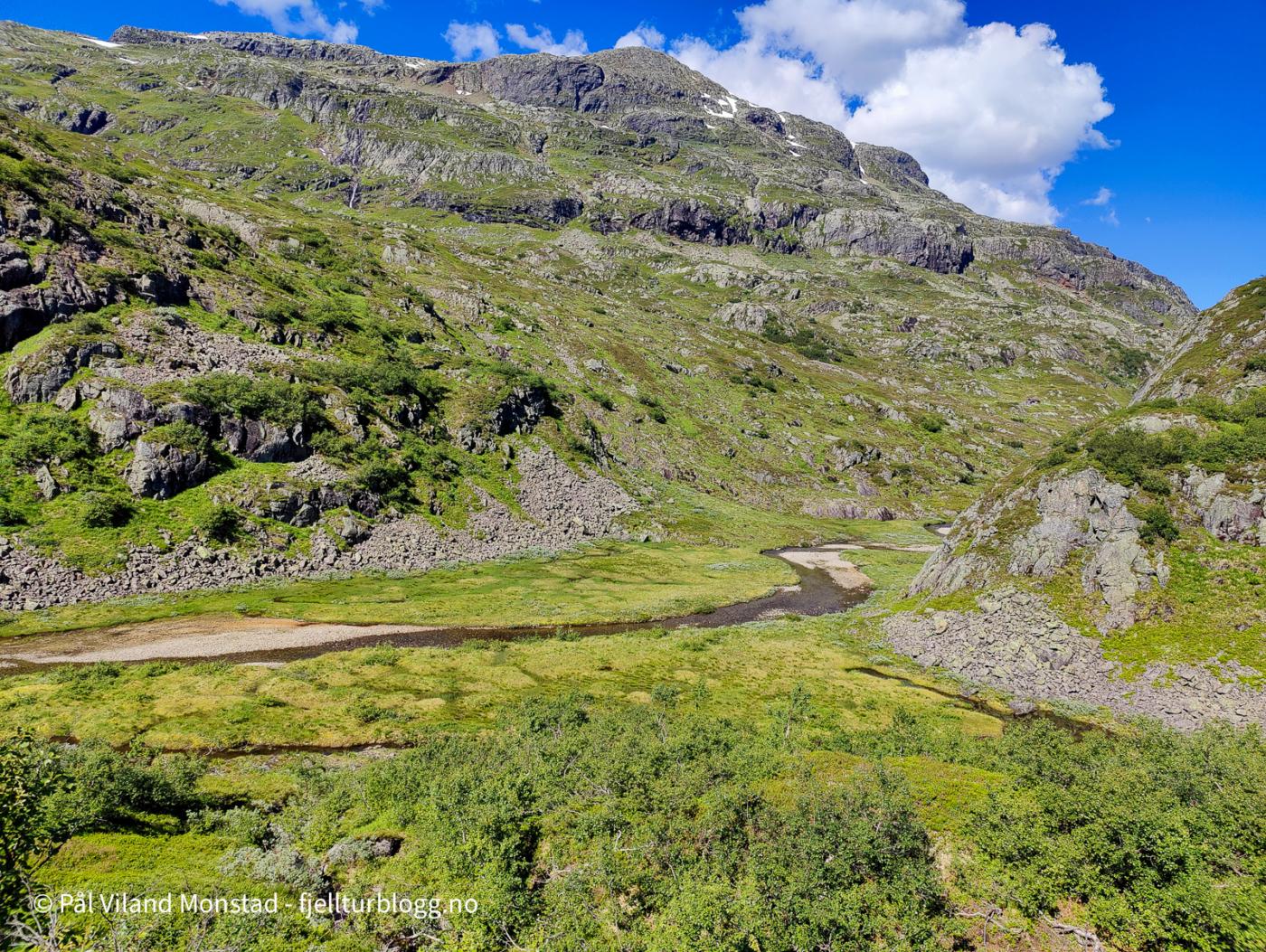 På flaten sørvest for Steinbu var det svært idyllisk. Elva rant rolig gjennom dalen og sauer beitet på motsatt side. Her tok jeg av fra stien i retning Svonuten. I følge kartet skulle det være flere bratte partier i starten, noe som stemte godt. Også her var det lav fjellbjørk, som har en tendens til å bremse farten til turgåeren.