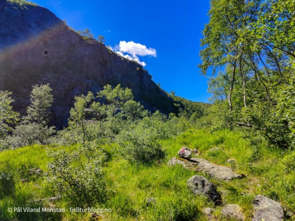 Stien var tydelig og god innover Jutadalen. Ved stikrysset (ikke skilta) mot Skithaug bar stien preg av å være mindre brukt, men den var fortsatt rødmerket. Jeg tviler på at dette strekket mot Roalkvam er mye besøkt av turgåere.