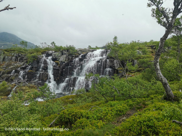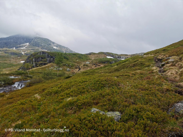 Jeg kom ned til Tengesdalsstølen, og fulgte tydelig sti til broa som gikk over utløpet av Risvatnet. Jeg fant en sti langs vannet, men etter noen hundre meter forsvant den. Like greit, for jeg skulle opp i høyden. Jeg var nå flere hundre meter lavere enn tidligere på turen, og det var av den grunn mye vegetasjon. Fjellbjørk og busk og kratt. Og skrenter. I det hele tatt ganske tungt og uryddig terreng oppover mot Litlehei.