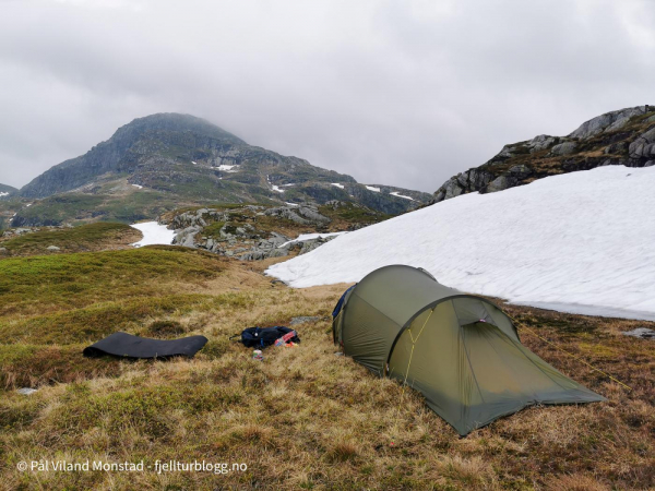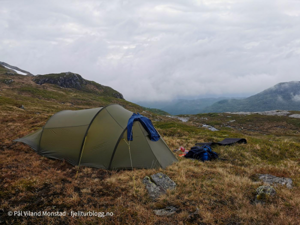 Tåka holdt seg i høyden, og faktisk i dalen under meg. Det passerte tåkedotter helt til jeg gikk og la meg. På ett tidspunkt var det solstråler på teltet, rett før sola gikk ned. Jeg gikk ikke ut for å sjekke forholdene. Værmeldingen varslet uansett strålende vær dagen etter.