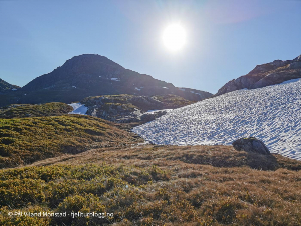 Værmeldingen stemte, og det var sol fra klar himmel da jeg våkna litt over sju. Bare å pakke teltet og få i seg mat, før dagens første topp kunne bestiges. Jeg hadde fulgt tydelig sti helt til teltplassen dagen før. Den fulgte jeg nå litt lenger, før jeg tok av i terrenget i retning Vardanuten. Greit å gå, og ikke veldig bratt, før jeg kom rett under toppen. Da var det god stigning. Sekken hadde jeg satt fra meg under toppen, for jeg skulle ned samme vei.