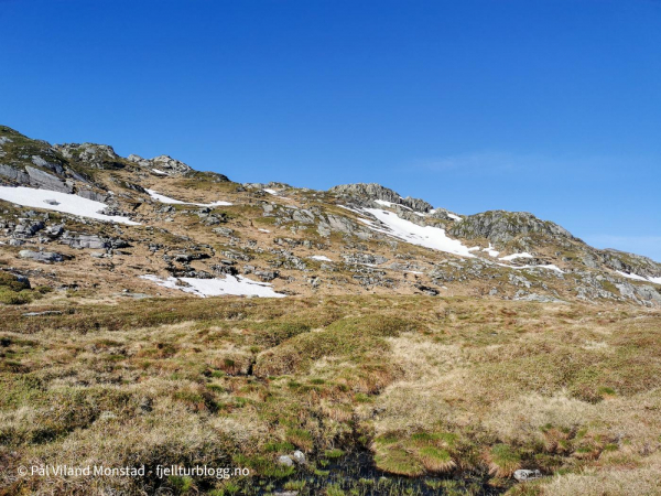 Selv om Skorvenuten så vidt ligger over i Suldal kommune, var den merket med Sauda Seven Summits. Neste topp var Svartavassnuten. Ganske uangripelig fra vest. Jeg hadde studert eventuelle oppstigninger på veien, men endte nå opp med å gå langs foten av fjellet på sørsiden. Forhåpentligvis ville det være bedre muligheter for bestigning fra øst.