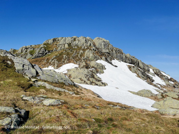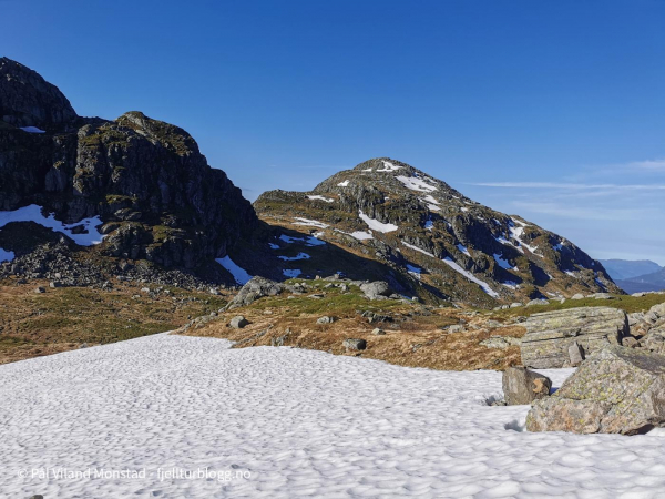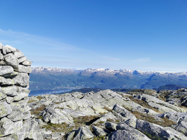 Ytre Kjeringsnuten hadde ikke noen varde å skryte av. Flott utsikt var det, men jeg begynte å kjenne at det var en stund siden frokost, så det var bare å komme seg avgårde ned til sekken, for å ordne mat.