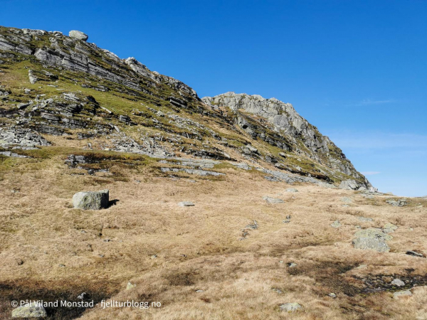 Jeg kom meg bort til ura, og kartet viste at det ville være et strekk på 300 meter med ur. Det gikk derimot overraskende greit, og raskt, å komme gjennom ura. Etter hvert kom jeg bort til hytta som var inntegnet på kartet. Hytta så ikke ut til å ha vært brukt eller vedlikeholdt i dette tusenåret. Det tok litt tid før jeg fant stien som også viser på kartet. Jeg mistet den flere ganger, helt til jeg så noen svære retningsvarder som tydelig viste hvor retningen i alle fall var. På toppen av skaret gikk det greit å finne sti og nødlinger nedover mot Maldalsstølen.