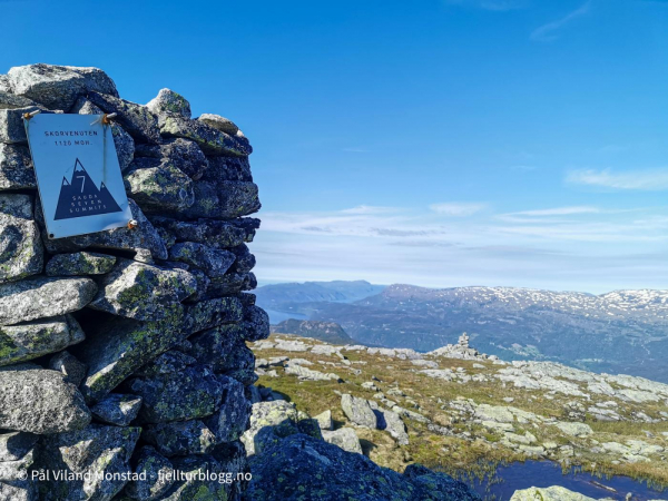 Toppen hadde flott varde, og fin utsikt. Jeg kom meg ned til sekken igjen, og fortsatte ferden ned i dalbunnen på sørsiden. Ferden fortsatte videre mot Skorvenuten. Skorvenuten, med sine 1124 moh var den høyeste toppen på turprogrammet denne gangen, og også den som krevde mest høydemeter opp. Ganske bratt et par partier. Også her satte jeg igjen sekken under selve toppen. Ingen grunn til å drasse 15 kilo ekstra helt opp.