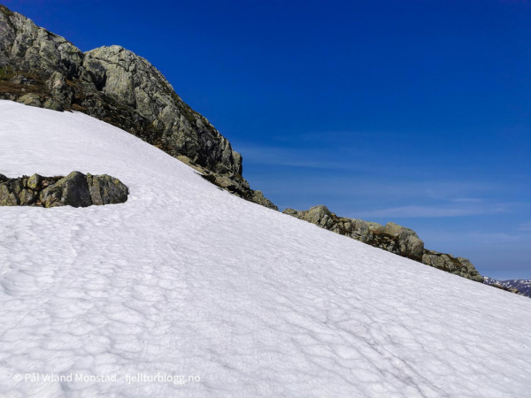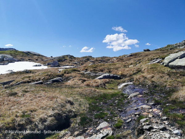 Ytre Kjeringsnuten hadde ikke noen varde å skryte av. Flott utsikt var det, men jeg begynte å kjenne at det var en stund siden frokost, så det var bare å komme seg avgårde ned til sekken, for å ordne mat.