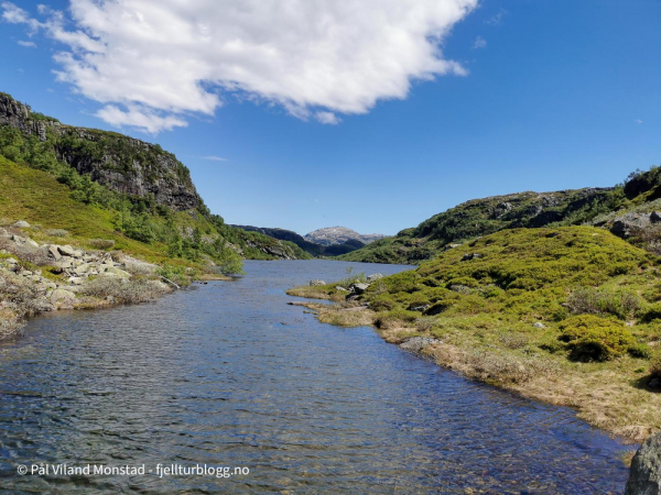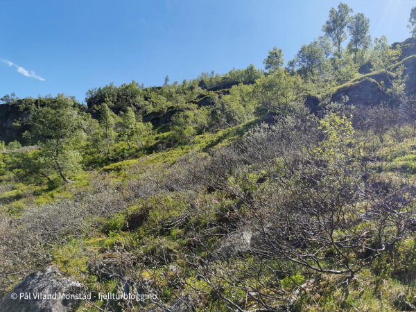 Jeg kom ned til Tengesdalsstølen, og fulgte tydelig sti til broa som gikk over utløpet av Risvatnet. Jeg fant en sti langs vannet, men etter noen hundre meter forsvant den. Like greit, for jeg skulle opp i høyden. Jeg var nå flere hundre meter lavere enn tidligere på turen, og det var av den grunn mye vegetasjon. Fjellbjørk og busk og kratt. Og skrenter. I det hele tatt ganske tungt og uryddig terreng oppover mot Litlehei.