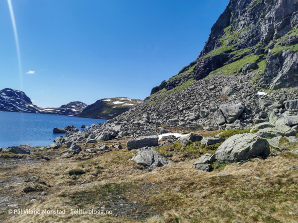 Jeg kom meg bort til ura, og kartet viste at det ville være et strekk på 300 meter med ur. Det gikk derimot overraskende greit, og raskt, å komme gjennom ura. Etter hvert kom jeg bort til hytta som var inntegnet på kartet. Hytta så ikke ut til å ha vært brukt eller vedlikeholdt i dette tusenåret. Det tok litt tid før jeg fant stien som også viser på kartet. Jeg mistet den flere ganger, helt til jeg så noen svære retningsvarder som tydelig viste hvor retningen i alle fall var. På toppen av skaret gikk det greit å finne sti og nødlinger nedover mot Maldalsstølen.