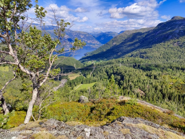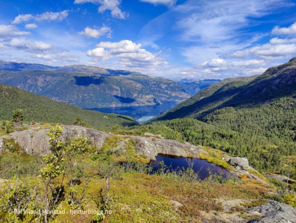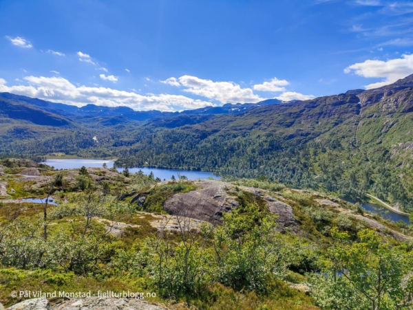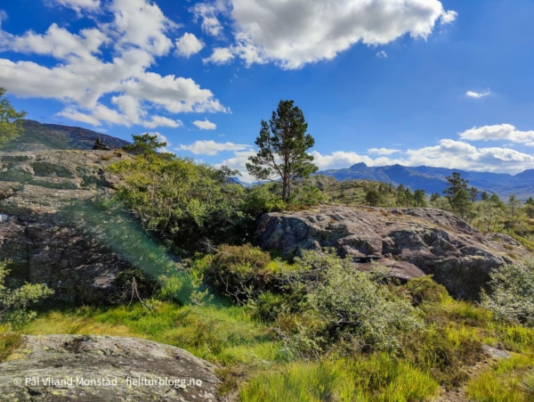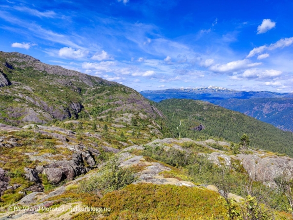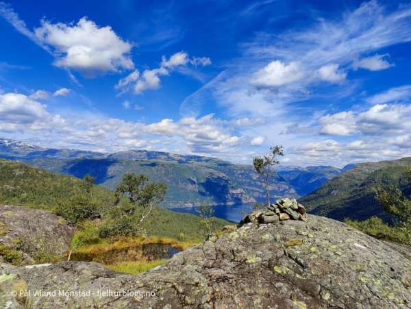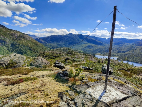 Etter å ha studert kunsten, eller ikke, fortsatte jeg til det høyeste punktet litt lenger øst. Punket hadde rester av et trigonometrisk punkt. Fin utsikt mot Mosvatnet og toppene innover. En time senere var jeg tilbake ved bilen. En fin topptur i lettgått terreng, med fin utsikt mot Suldalsvatnet og Mosvatet.
