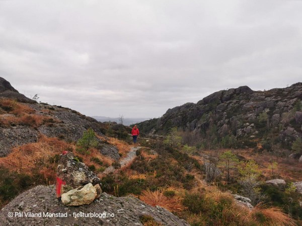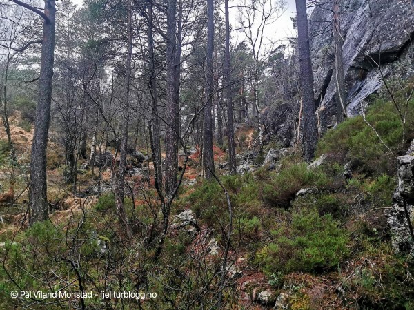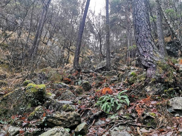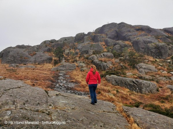 I starten var det bratt. Merket rute var mer bekk enn sti. Stedvis klyvepartier, men ikke lange stykket før det flatet ut. Vi tok litt feil i et stikryss. Godt mulig stien hadde ført til målet, men uten at den var tegnet inn på kartet gikk vi de få metrene tilbake og fulgte stien som var på kartet.