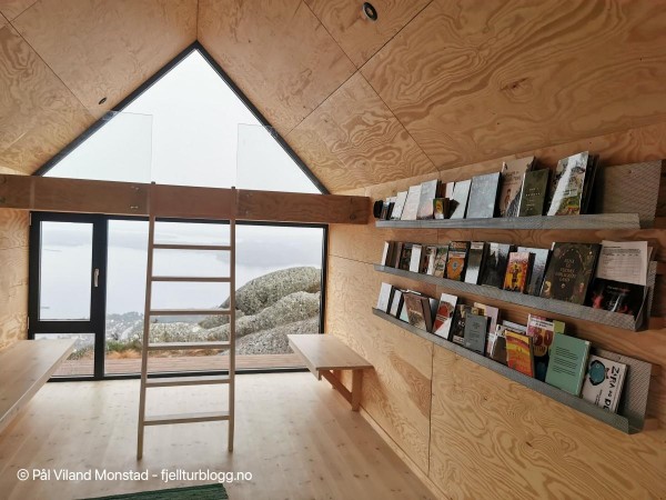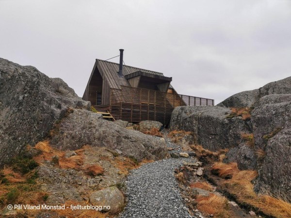 Tregrensa var lav, og det var lett å gå på snaufjellet innover og opp mot toppen. Ved toppen dukket en “dagsturhytte” opp. Hytta var åpen og er beregnet for kortere opphold uten overnatting. Vedovn, og egen utedo. Svært fin hytte som i grunnen hadde egnet seg for pauserom på dagens tur. Gråvær, men to toppvandrere som hadde enda en topp på programmet. Noen pause ble det derfor ikke tid til.