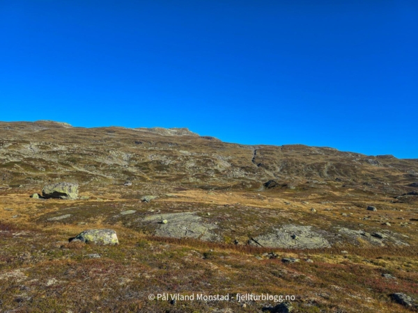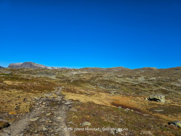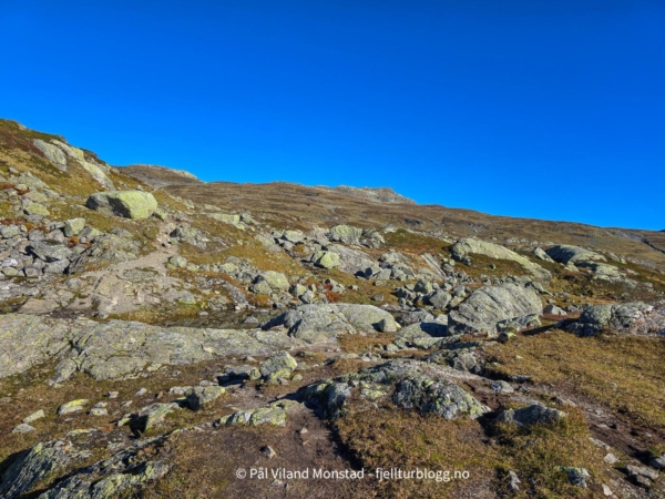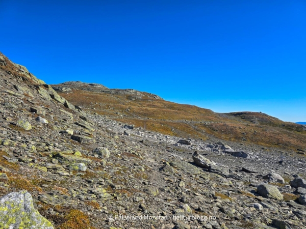 Store deler av turen går på T-merket sti i retning Hellevassbu. Etter en god motbakke helt i starten, med til dels jørmete sti mellom busk og kratt, flater det ut. Det er svært lettgått terreng nordover den tydelige stien.